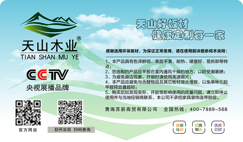 天山木業(yè)歷來重視板材的市場規(guī)范工作,公司本著"質(zhì)量為本,誠信經(jīng)營,服務(wù)用戶"的經(jīng)營宗旨,為了區(qū)分假冒偽劣產(chǎn)品,提高消費(fèi)者利益。